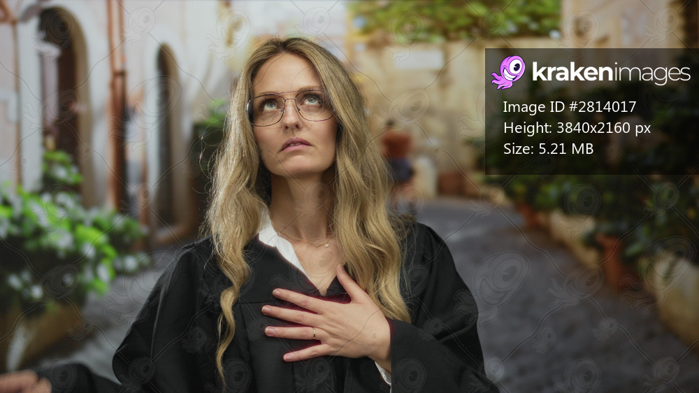 Woman presses hand to chest in frustrated pose on street beside young blonde judge wearing uniform outdoors in urban setting.