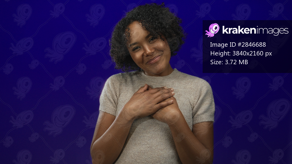 Woman presses hand to chest while smiling gently in studio with deep blue backdrop wearing soft beige sweater; gratitude.