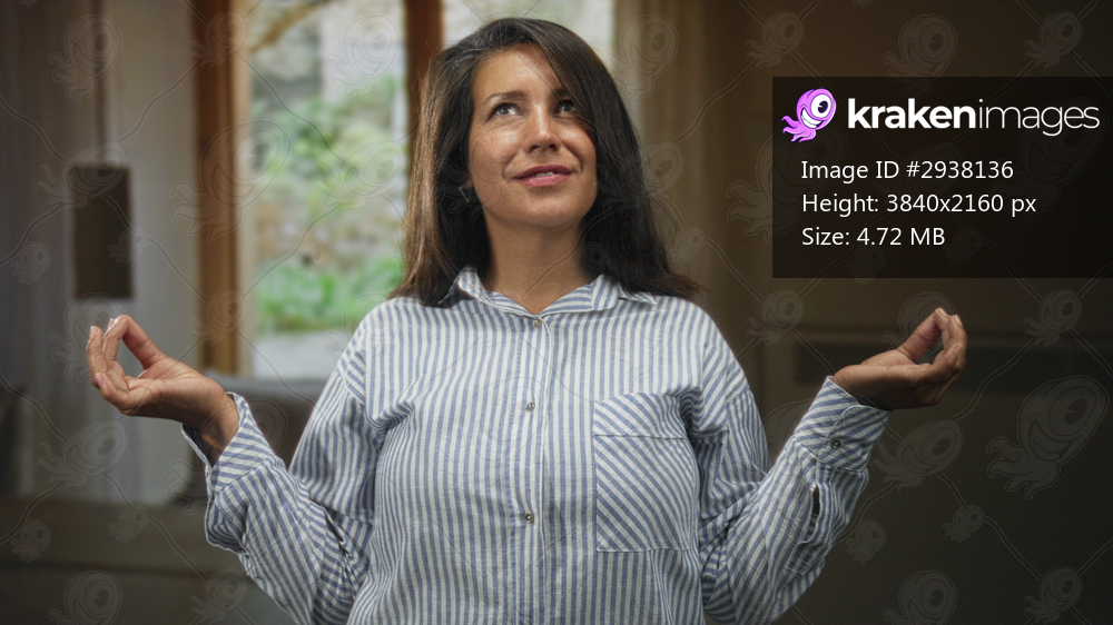 Woman presses hands in prayer with palms together inside a building, eyes closed and gentle smile; serenity mindfulness gratitude.