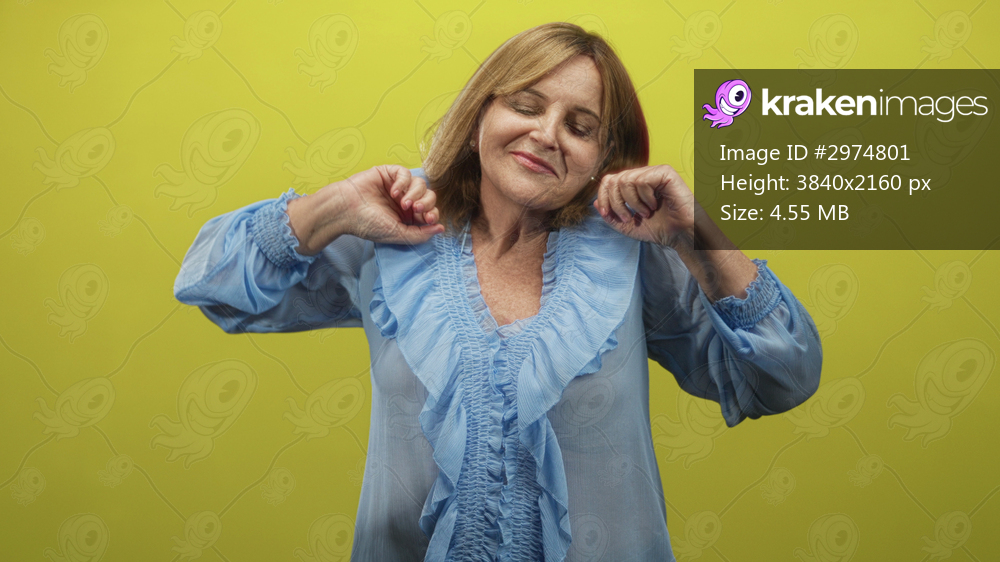 Woman presses hands to cheek in studio against yellow backdrop wearing blue ruffled blouse; serenity contentment.