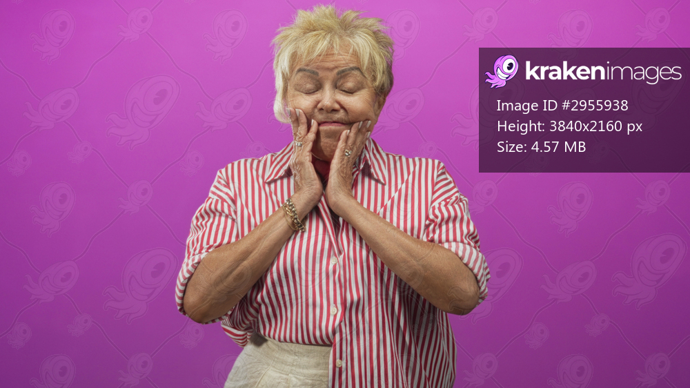 Woman presses hands to cheeks with closed eyes, wearing red striped shirt in studio; serenity calm reflection.