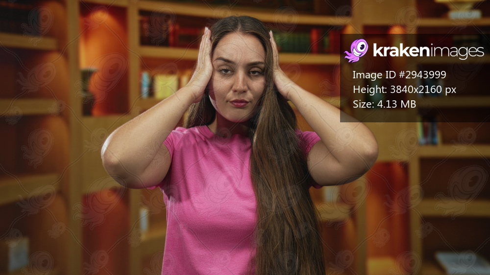 Woman presses hands to temples inside a library building, long hair and pink shirt visible; stress fatigue.