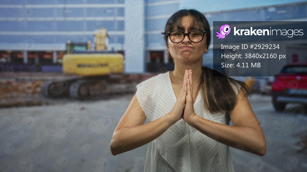 Woman presses hands together in prayer gesture at a construction building, wearing glasses; pleading apology.