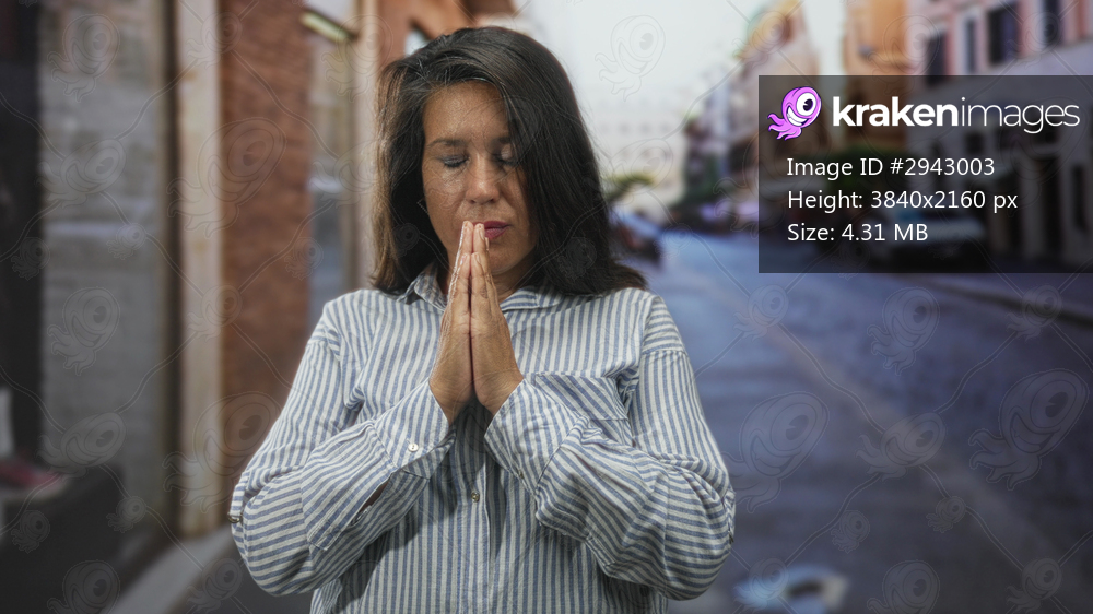 Woman presses hands together in prayer on a city street, eyes closed, wearing a blue and white striped shirt; contemplation.