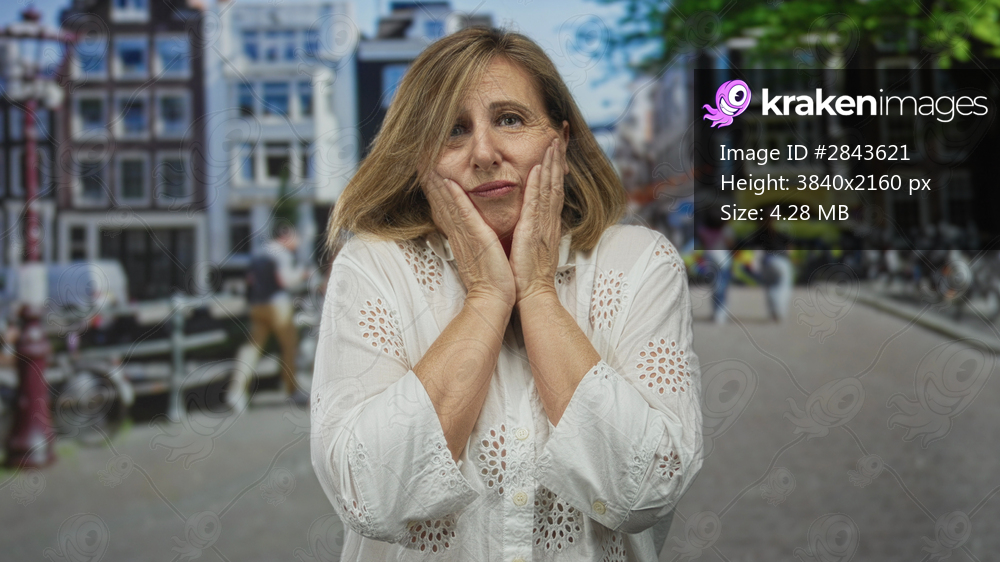 Woman presses her cheeks with both hands on a sunny european street lined with bicycles and canal houses; thinking.