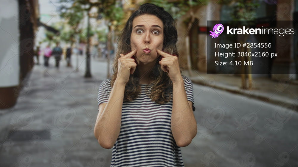 Woman presses her cheeks with index fingers on a bustling street lined with trees and storefronts; playfulness.