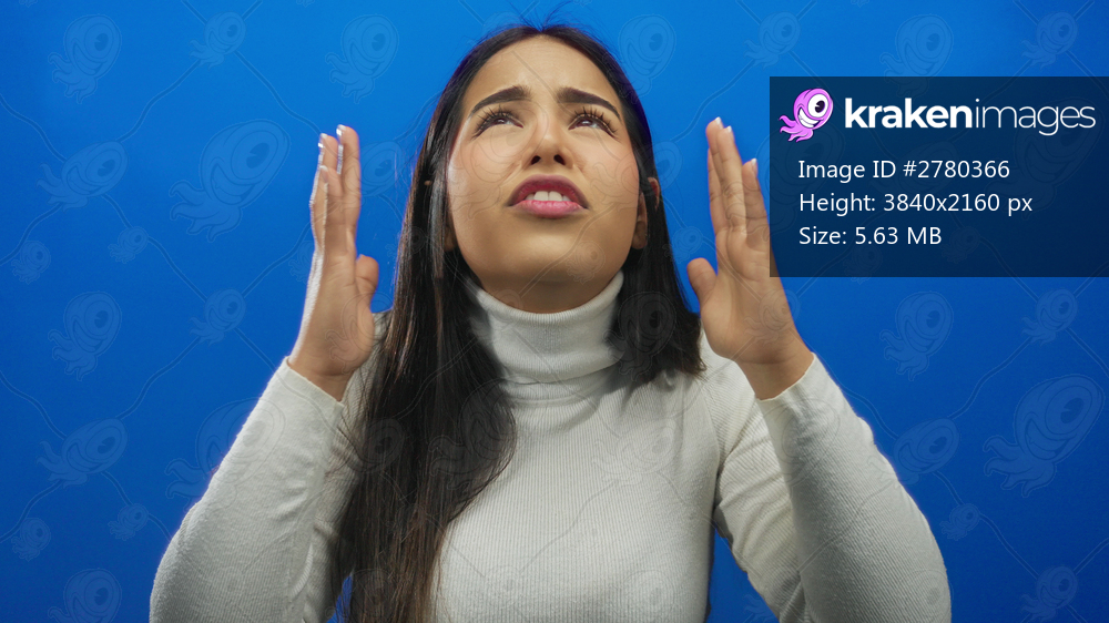 Woman presses her ears while covering her face framed by a background where a young latin hispanic figure stands against an isolated blue wall.
