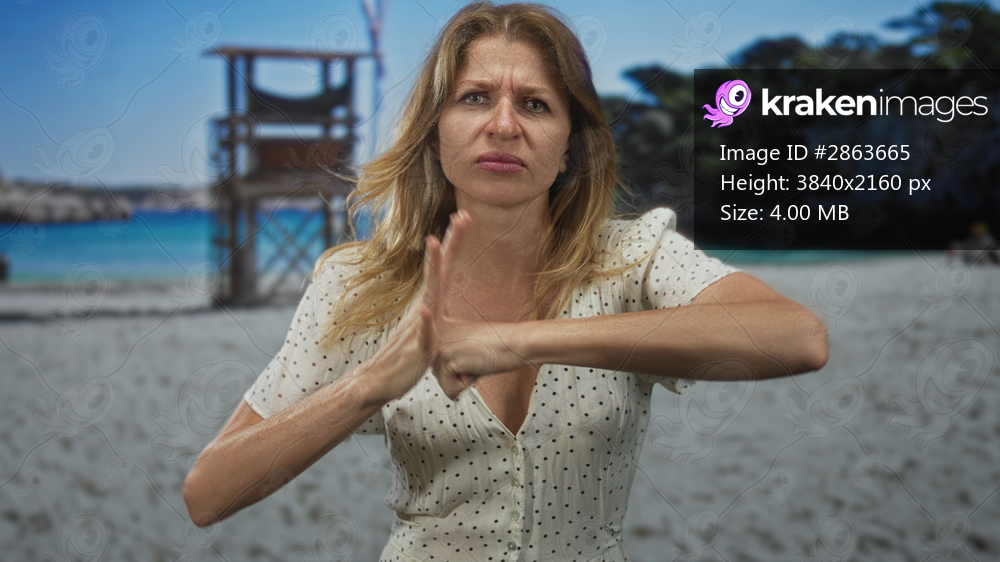 Woman presses one palm with the other in front of a lifeguard tower building on a sandy beach; defiance.