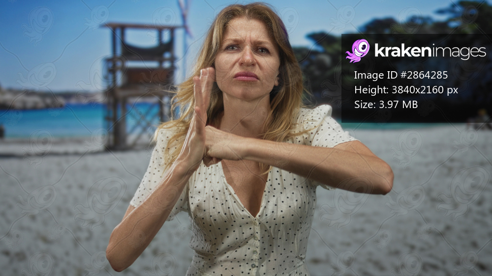 Woman presses one palm with the other in front of a lifeguard tower building on a sandy beach; defiance.