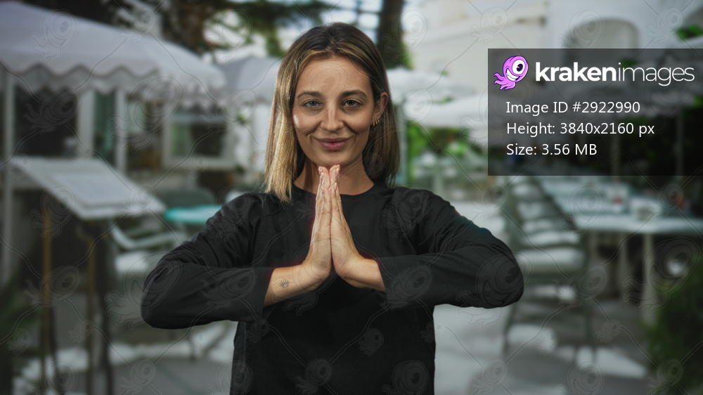 Woman presses palms together in namaste gesture on restaurant terrace with visible hands and wrist tattoo; mindfulness serenity.