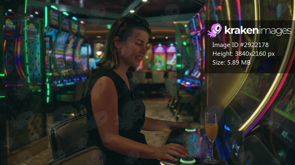 Woman presses slot machine button with drink glass at her side and sunglasses on head in casino building; quiet focus calm.