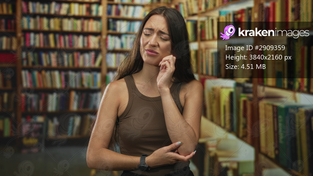 Woman pressing cheek with hand, grimacing surrounded by rows of books in a library building; toothache pain.