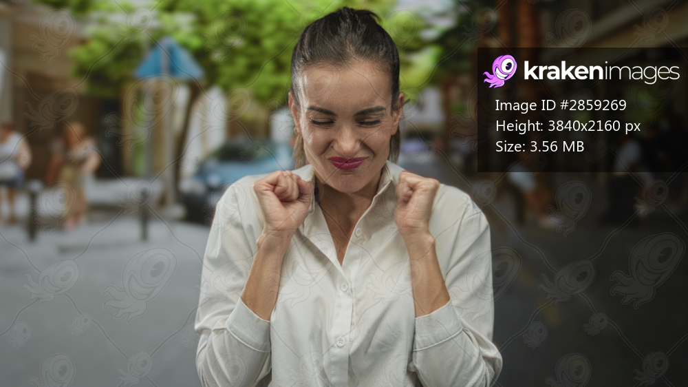 Woman pressing cheeks with both hands while wincing in a white shirt on a busy street near a storefront; discomfort.