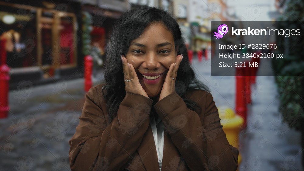 Woman pressing cheeks with hands while wearing brown coat on a cobblestone city street lined with red bollards; surprise joy astonishment wonder.