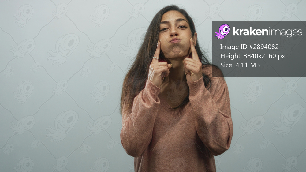 Woman pressing cheeks with index fingers in studio with pale blue gray backdrop; playful mischief confidence.