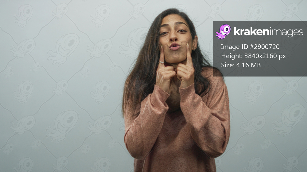 Woman pressing cheeks with index fingers in studio with pale blue gray backdrop; playful mischief confidence.