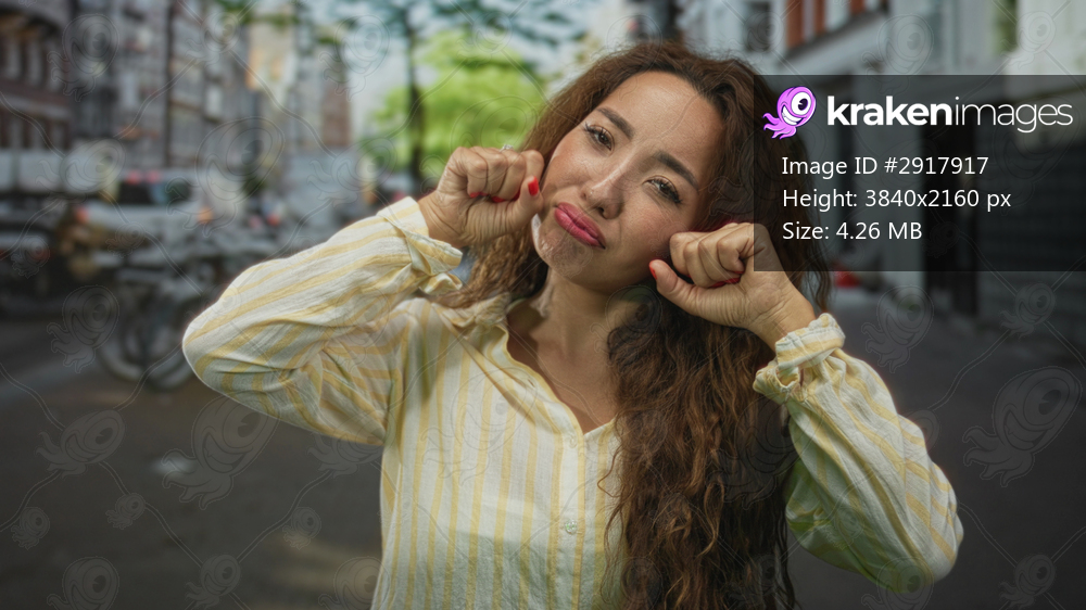 Woman pressing clenched fists to her cheeks with a pouty crying face on a busy city street; playful mock sadness.