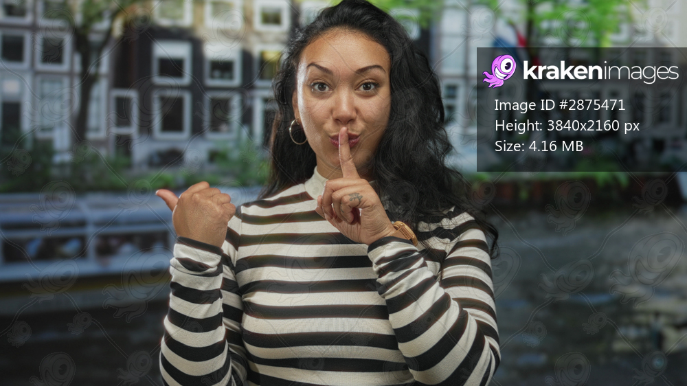 Woman pressing finger to lips while pointing thumb toward a canal street in amsterdam, wearing striped top; playful.