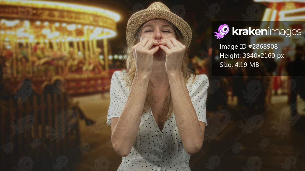 Woman pressing fingers to lips in chef kiss gesture at street fair carousel at night, straw hat and polka dot dress visible; joy celebration.