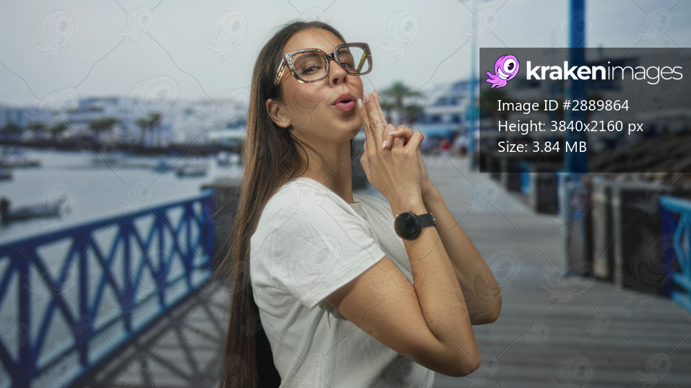 Woman pressing fingers to lips on street promenade by the seaside wearing white t shirt and tortoiseshell glasses with long hair; carefree.