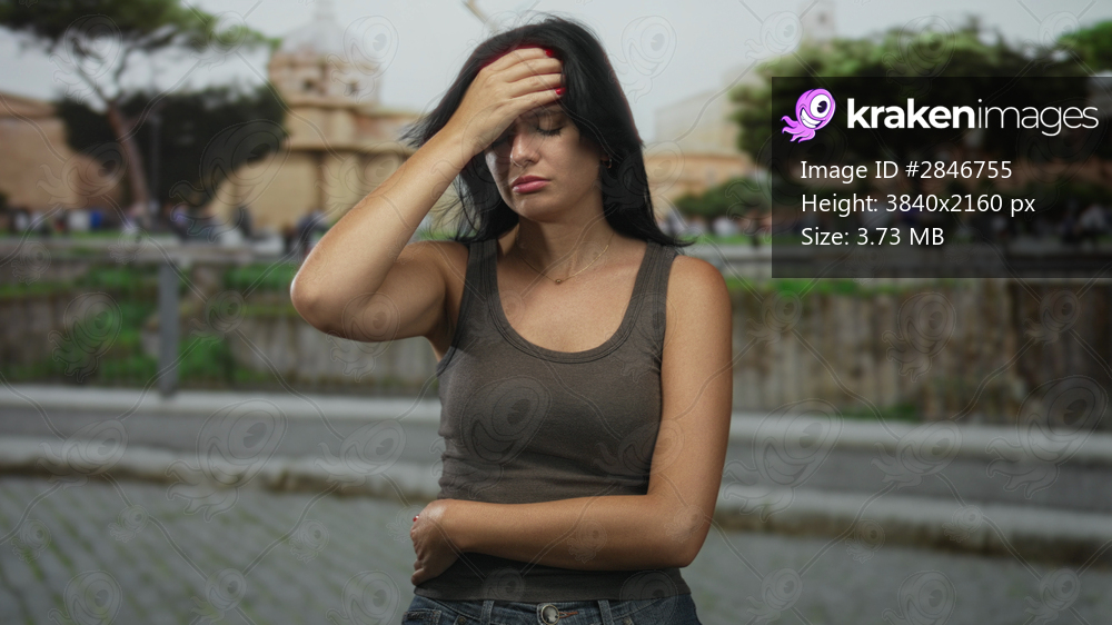 Woman pressing hand to forehead on busy cobblestone street near ancient building in bright sunlight; stress.