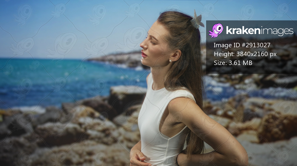 Woman pressing hand to lower back, grimacing with visible backache in studio seaside set by rocks and water; discomfort recovery.