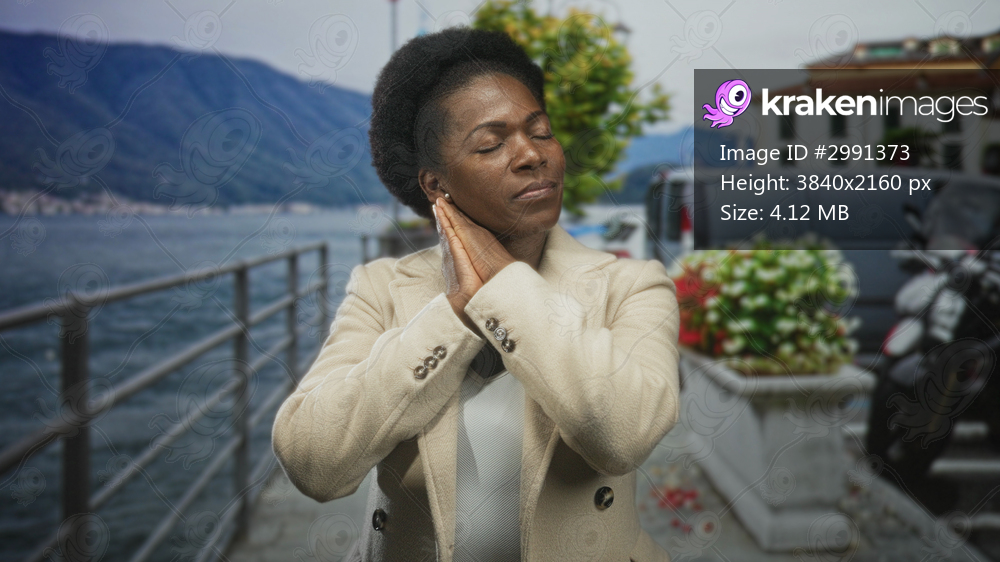Woman pressing hands to cheek and resting eyes closed on a lakeside street, beige coat and railing with parked motorcycle visible; calm reflection.