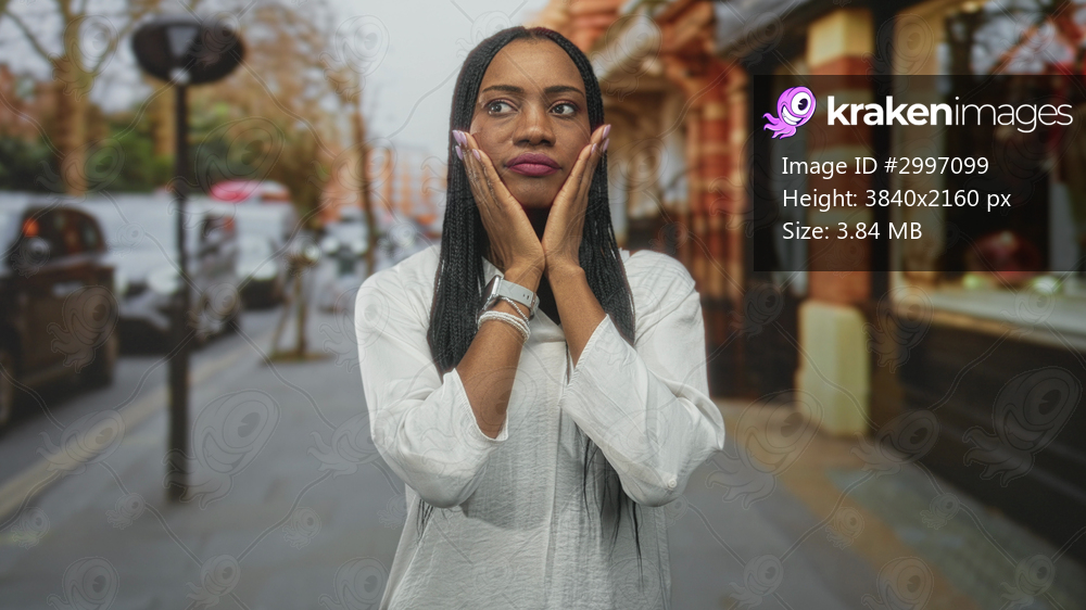 Woman pressing hands to cheeks, looking thoughtful, wearing white blouse, standing on street beside a brick storefront and parked cars; pensive solitude. - Kraken Images
