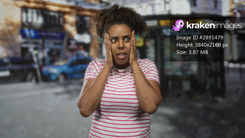 Woman pressing hands to cheeks on a busy city street near a newsstand, wearing pink striped shirt and looking startled; surprise concern.