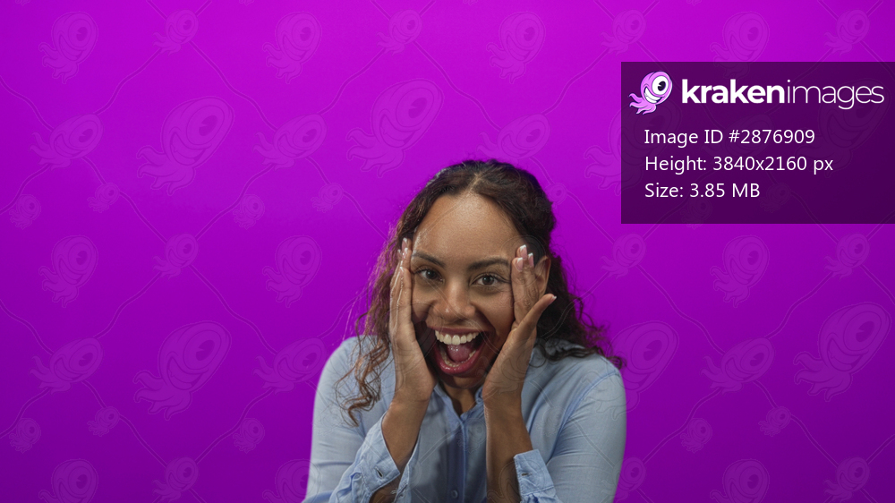 Woman pressing hands to cheeks with open mouth in purple studio magenta backdrop, visible hair motion and frontal pose; surprise energy.