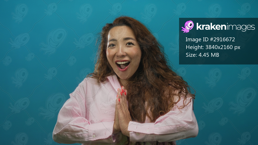 Woman pressing hands to cheeks and palms together, open mouth surprised expression in studio with teal backdrop; surprise.