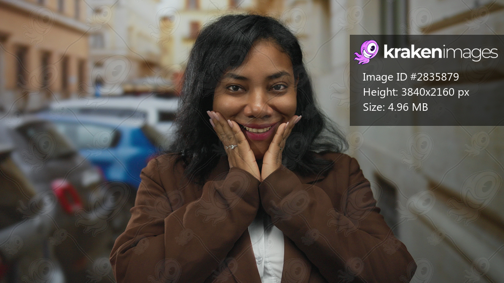 Woman pressing hands to cheeks while smiling gently in a brown jacket on a busy city street in soft morning light; curiosity wonder inquisitiveness exploration. - Kraken Images