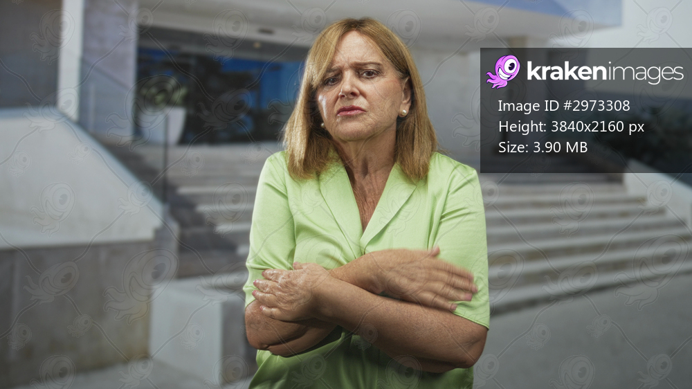 Woman pressing hands to chest and rubbing palms while wincing in front of building stairs and entrance; discomfort vulnerability.