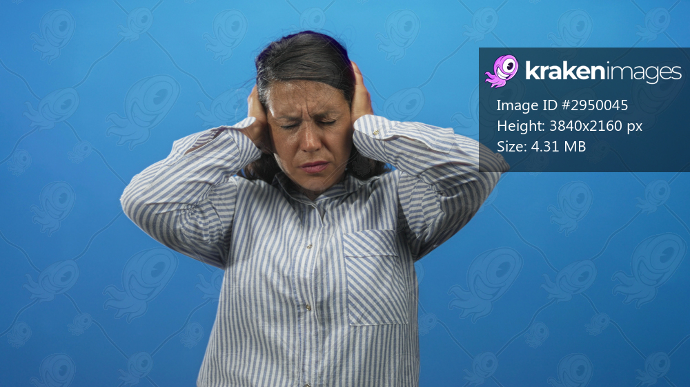 Woman pressing hands to ears in a blue studio wearing a striped button shirt, eyes closed and grimacing with tense posture; anxiety overload.