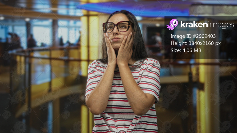 Woman pressing hands to face with eyes closed, wearing striped shirt and glasses in hotel building lobby; exhaustion.