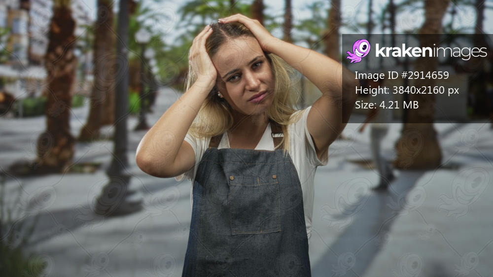 Woman pressing hands to head on a palm lined street wearing denim apron and white shirt, palms visible and head bowed; anxiety.