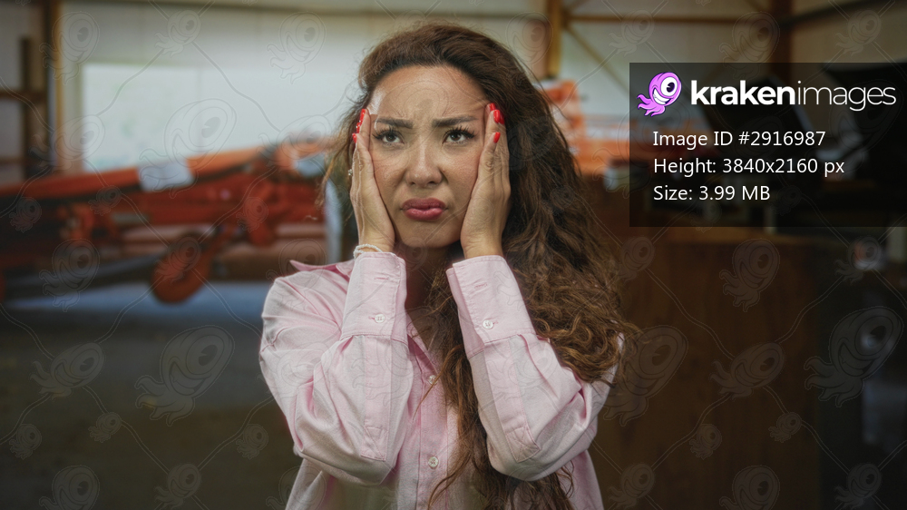 Woman pressing hands to temples for headache inside building workshop near orange equipment, wearing pink shirt and red nails; stress fatigue.