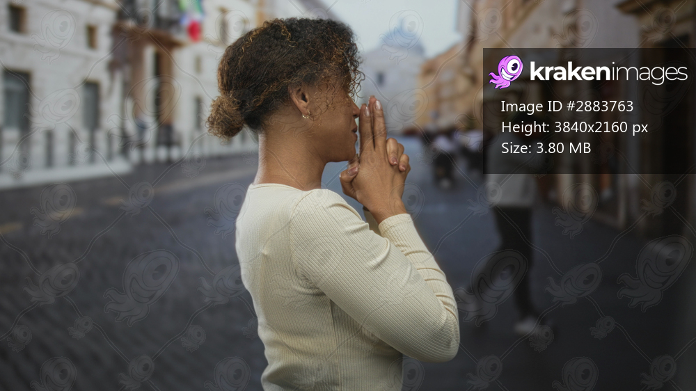 Woman pressing hands together by face, smiling and turning in a cobblestone street with blurred tourists and historic buildings; hope.