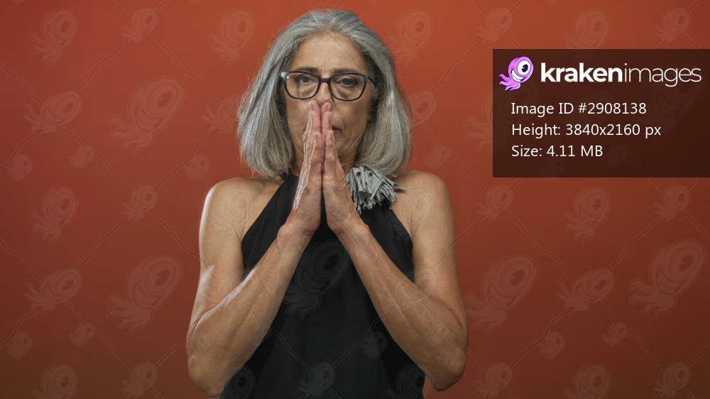 Woman pressing hands together in prayer with bare arms visible in studio; serenity reflection faith.