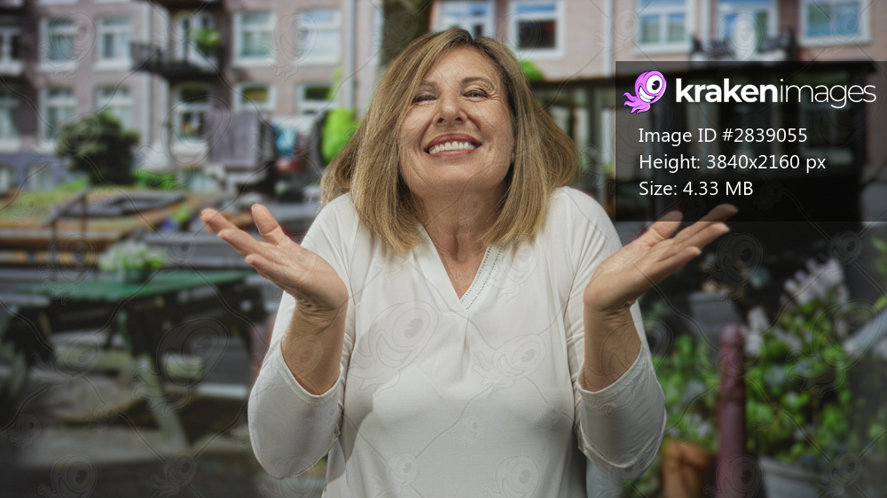 Woman pressing hands together in prayer gesture with smiling face on street by urban buildings and sidewalk; serenity gratitude.