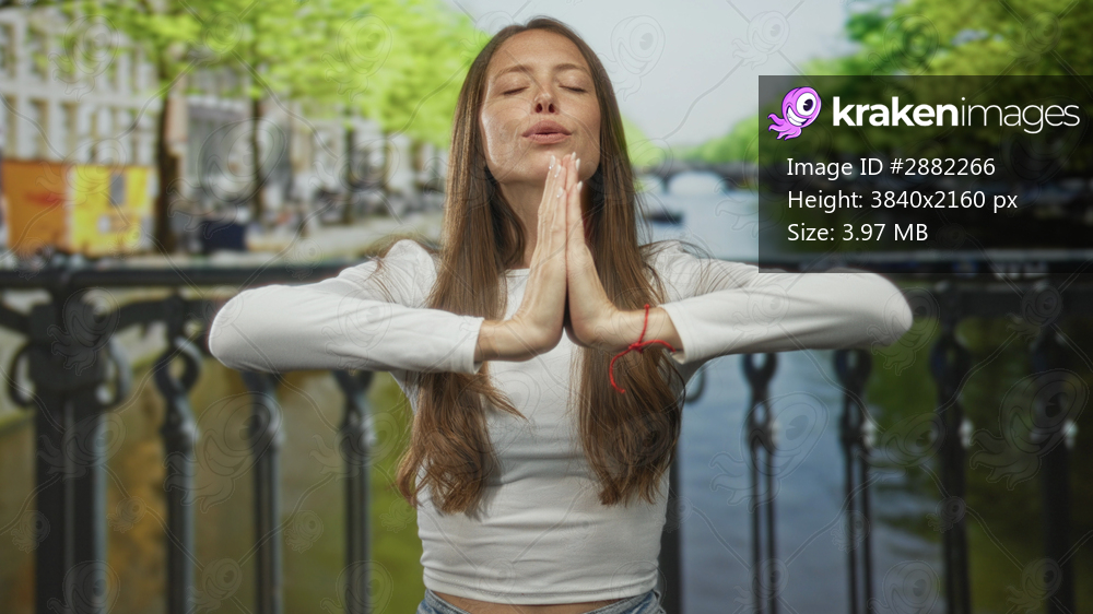 Woman pressing hands together in prayer on a street bridge in amsterdam; serenity mindfulness meditation.
