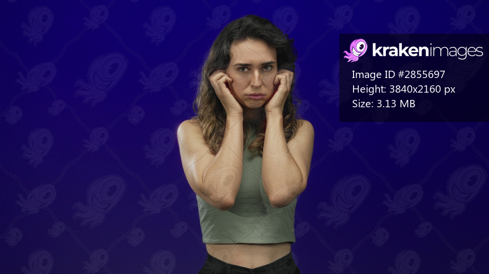 Woman pressing her ears with hands against her head in purple studio setting; discomfort isolation unease.