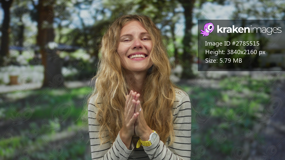 Woman pressing her hands clutch her chest in a park, a blonde young figure offers a soft smile with closed eyes expressing gratitude for nature.
