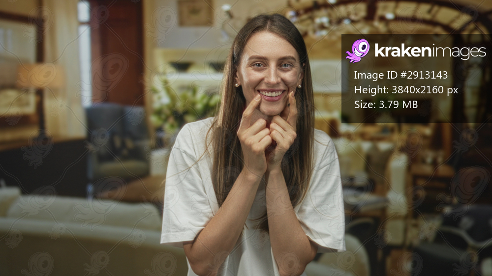 Woman pressing index fingers to cheeks and smiling, long hair visible, seated in a living room with couch and chandelier; playful joy.