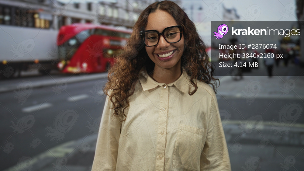 Woman pressing index fingers to cheeks while puckering lips on a busy street with a red bus and glasses visible; playful.