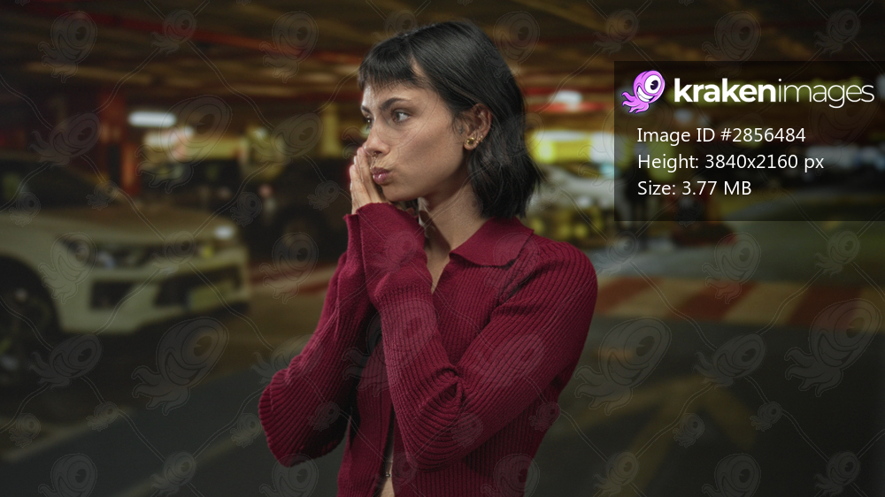 Woman pressing palms against cheek under neon lights in dim indoor parking building beside parked car wearing red sweater; anxiety.