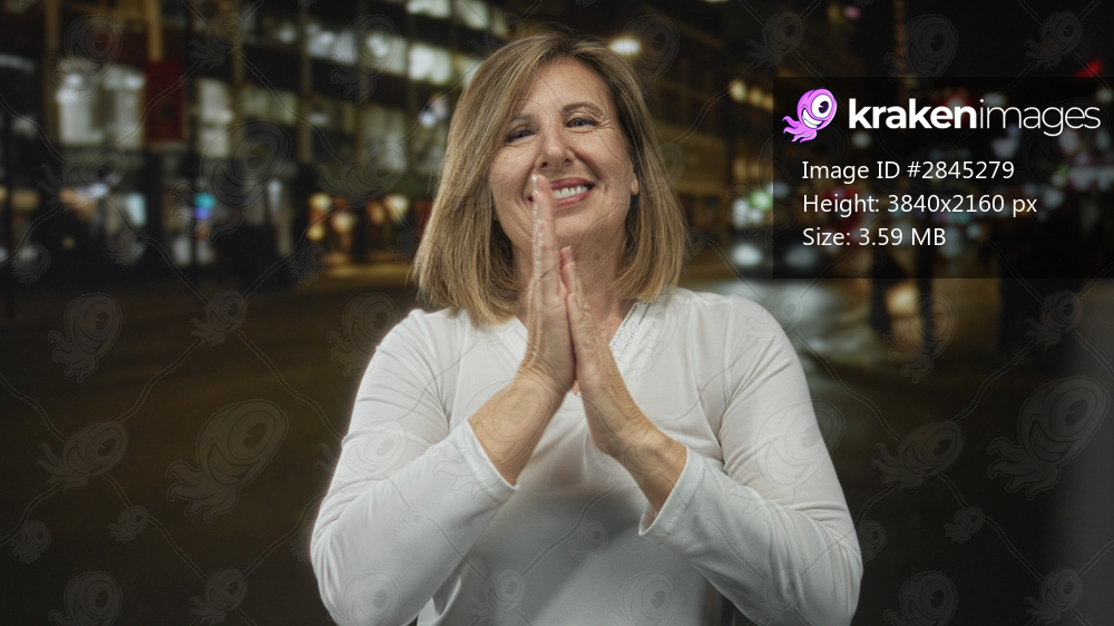 Woman pressing palms together at chest in bright city street at night with blurred headlights, reflective shop windows visible; hope.