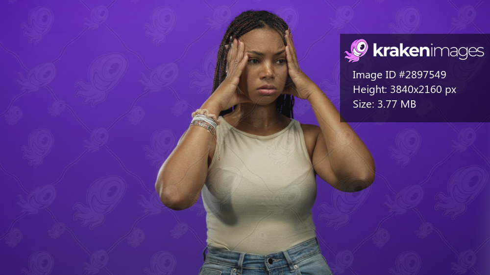 Woman pressing temples with both hands in purple studio for a headache and tense expression; pain stress fatigue discomfort.