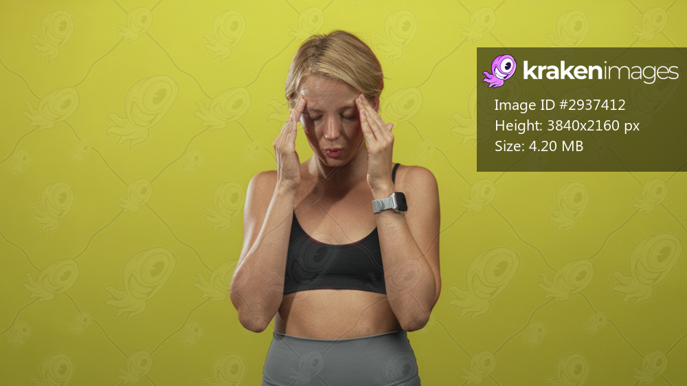Woman pressing temples with both hands, wearing a black sports bra, smartwatch and gray activewear against a yellow studio backdrop; stress.