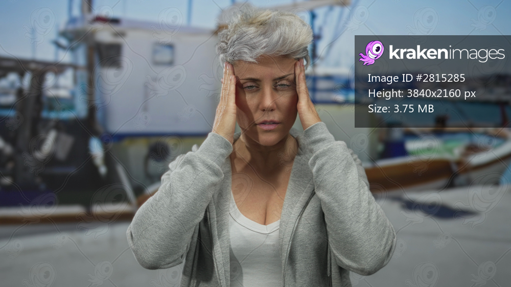 Woman pressing temples with both hands while standing on a white fishing boat deck at a sunny port; stress.